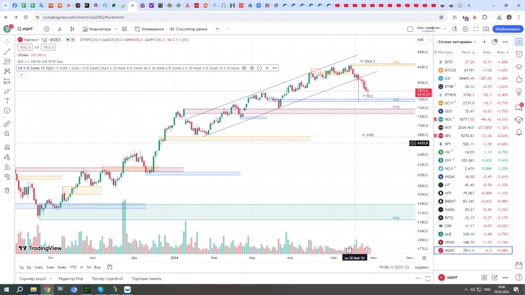В случае ухода ниже гориз.уровня 7755 для входа в лонг ждем поддержек ниже — гориз.уровня 7374,5 и границы черного канала(7173 на сегодня)