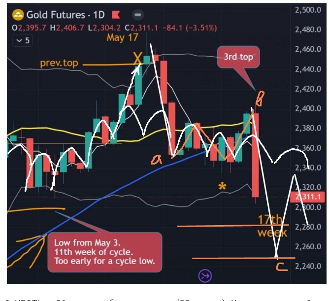 🪙 ЗОЛОТО — 17-я неделя базового цикла (15-19 недель). Цикл очень зрелый. Слабый сигнал от 3 июня сработал, но его хватило только на обещанную неделю назад (https://t.me/jointradeview/118) третью вершину. Возможно экстремум 7-10 июня отработал на разворот от третьей вершины, но надо дождаться 10 июня и посмотреть на поведение золота и индикаторы. Ориентировочные уровни по ближайшему фьючерсу 2310 (достигнут) и 2260. Если движение вниз продолжится, следующие экстремумы 17 и 20 июня (слабые сигналы).