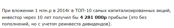 При вложении 1 млн.р в 2014г в ТОП-10 самых капитализированных акций, инвестор через 10 лет получил бы 4 281 000р прибыли (это без пополнений, но с учетом реинвеста дивидендов).