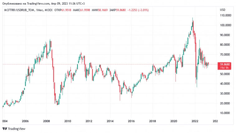 Ayrisu, более-менее репрезентативная точка начала отсчёта — середина 2003-го года. Берём MCFTRR, переводим в баксы, имеем: