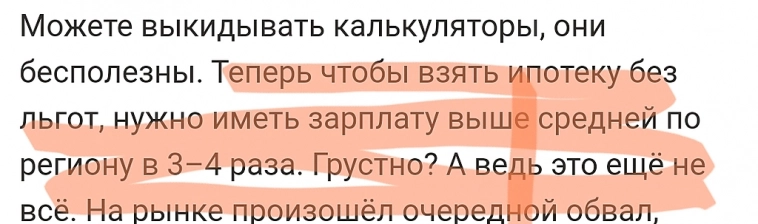 Можете выкидывать калькуляторы, они бесполезны. Теперь чтобы взять ипотеку без льгот, нужно иметь зарплату выше средней по региону в 3–4 раза. Грустно? А ведь это ещё не всё. На рынке произошёл очередной обвал, доллар не хочет расти, везде пессимизм кроме оптимизма у тапателей хомяков. Нежно собрал самые интересные новости недели и упаковал их в этот пост. Го!