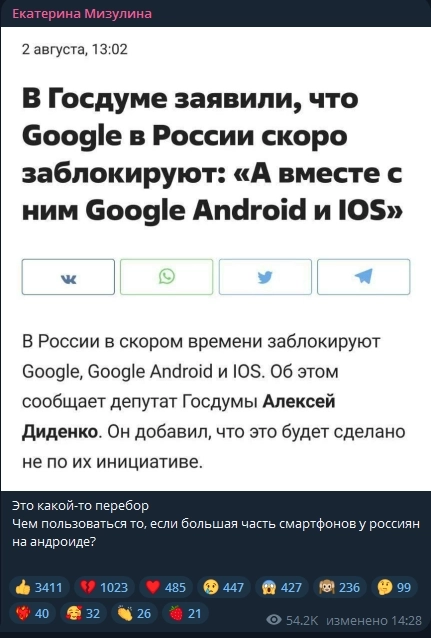 Мизулина назвала перебором блокировку в РФ смартфонов на Android и IOS