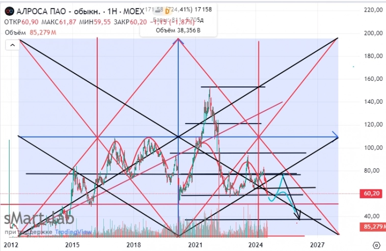 C 2015 года акции АЛРОСА стоят в широком боковике 50-150 р. за акцию. Средняя цена за эти 9 лет 70-100 за акцию. С мая акции упали с 82 до текущих 60. Ближайший уровень поддержки находится в районе 56-58 р. Индикаторы говорят о поиске точки для разворота. В любой момент можем начать как минимум отскакивать. Но можем и дойти до 56. Думаю, что мы скоро снова пойдем штурмовать уровень 80 р. Дальше надо будет снова смотреть за графиками и текущей ситуацией.
