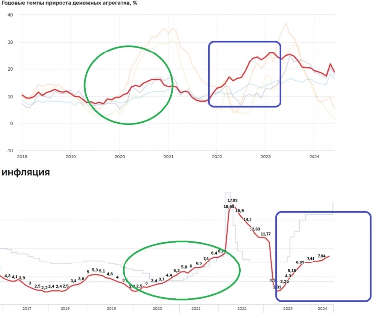 За 2023 год напечатали много денег, передний фронт денежного импульса очень крутой. В соответствии с ним через год мы начали получать такую же крутую инфляцию.