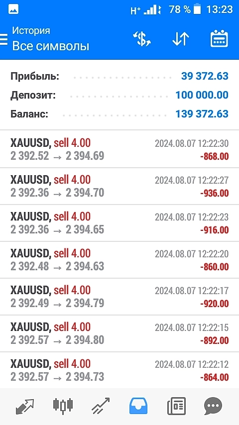Общее количество сделок 29, прибыльных 12, убыточных 17. Прибыль варьировалась в диапазоне от 5,11 $ до 6,22 $, убыток от 1,28 $ до 2,1$.
