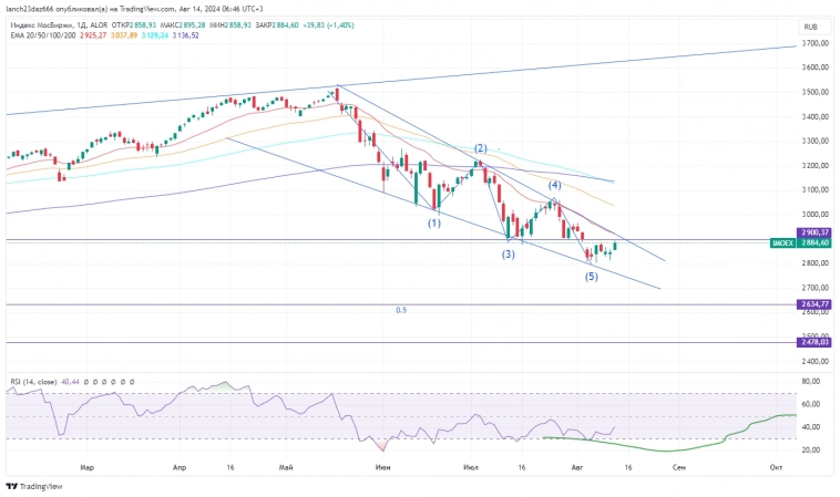 13.08.2024. Вчера индекс ММВБ закрыл день ещё одним зелёным «волчком» — «размышление» продолжается. Индекс сходил вниз к своим поддержкам (на сегодня — 2835 и 2820), снова отбившись от нижней, после чего остаток дня отрастал и на вечёрке даже пробил локальные сопротивления (на утро — кластерная зона 2854-2852), хотя и не оттестил их сверху. С утра ждём теста пробитых локальных сопротивлений: отбой даст сигнал на продолжение роста до более сильных локальных сопротивлений в зоне 2877-2880, а в случае их пробоя с ретестом — до первого сильного дневного сопротивления на 2904, пробой с ретестом которого даст нам первый робкий разворотный сигнал.