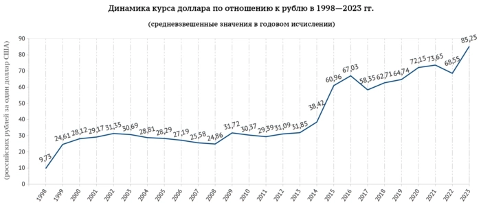 В 2013 курс был около 30, в 2014-2015 в моменте был 65. Инфляция выросла с 6% до 12%. Уже в 2016 году инфляция была 5%, при этом курс 60-70. Видите, какое экономическое чудо, инфляция всего на годик выросла и на 6% (суммарно от всех факторов), зато рублевые сбережения россиян в пересчете на доллары в 2 раза обесценились.