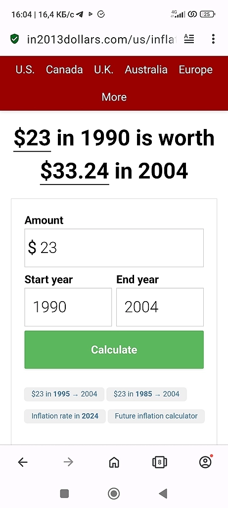 Инфляция в долларе с 1990 по 2000 — 32%, а к 2004 — 44%.