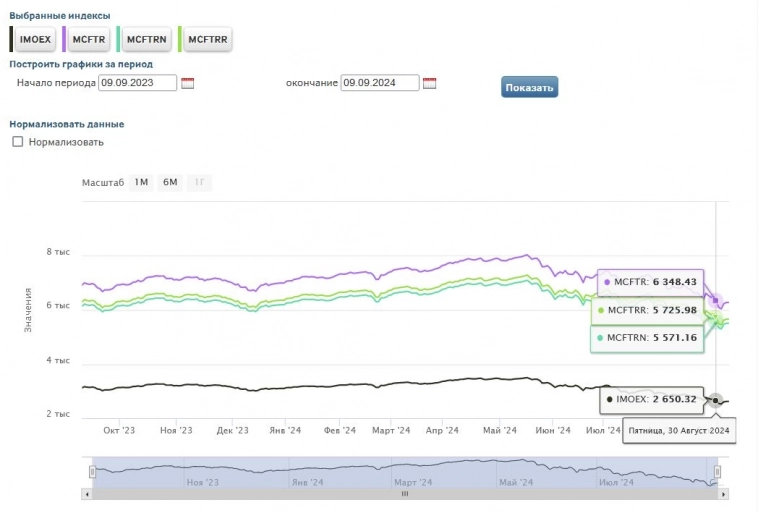 Если брать период последних 12 месяцев с 09.09.2023, то индекс полной доходности ММВБ снизился на -9,45%.