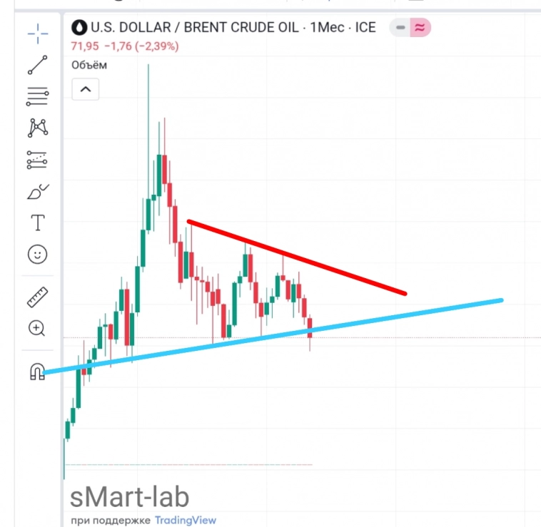 У себя в телеге я расписал, но тут достаточно двух линий, поддержка и сопротивление его прокололи, но если выкупят выше 76 пробой был ложный и могут порасти к красной линии сопротивления
