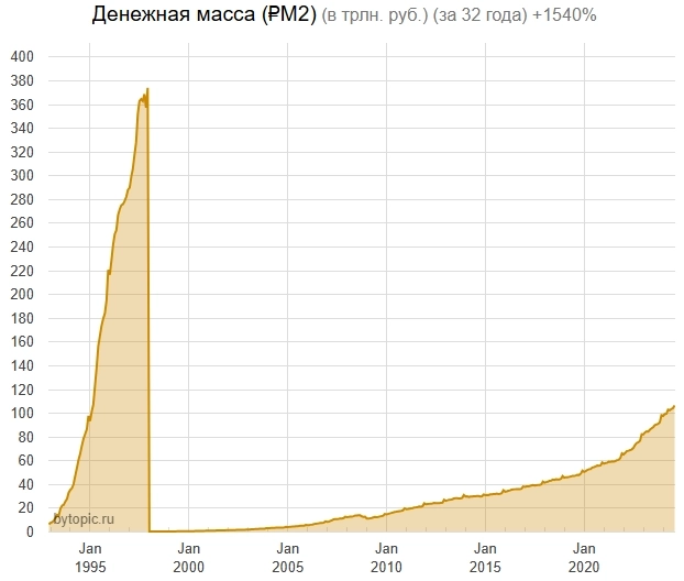 напоминаю, что в РФ с 1992 года нет закона, регулирующего объем эмиссии рублей… отсюда - дикая история денежной массы в РФ