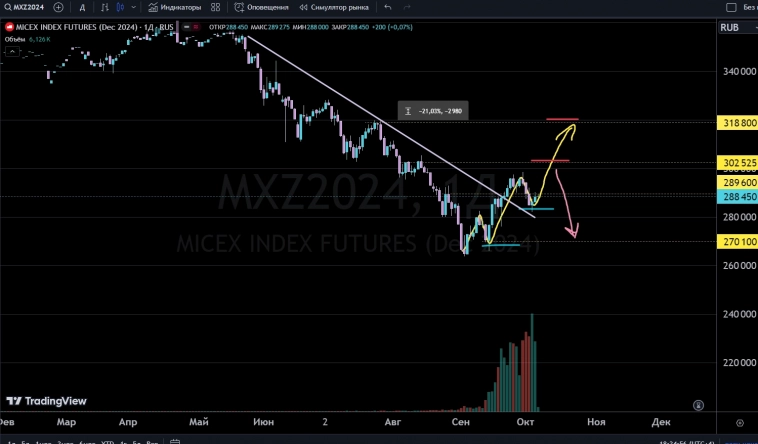 Если внимательно взглянуть на график, можно заметить, что текущая консолидация значительно больше по размеру по сравнению с предыдущими — примерно в два раза. Это свидетельствует о том, что в рынок накопилось в два раза больше энергии для последующего движения. Однако эта энергия, скорее всего, будет направлена вниз. Таким образом, прогнозируемый уровень снижения смещается с 2400 до 2200. И только на отметке 2200 рынок, вероятно, достигнет нового уровня поддержки, с которого начнётся очередная фаза консолидации.