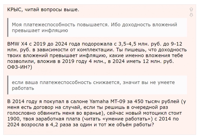 В 2014 году я покупал в салоне Yamaha MT-09 за 450 тысяч рублей (у меня есть договор на случай, если ты решишь в очередной раз голословно обвинить меня во вранье), сейчас новый мотоцикл стоит 1900, твоя заработная плата (читать «умение работать») с 2014 по 2024 возросла в 4,2 раза за один и тот же объём работы?