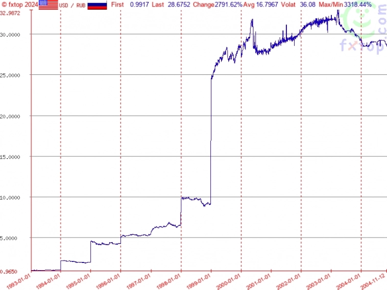 Процесс роста курса доллара практически ни чем не отличается до 1998. Шип… резкая девальвация, далее длительная проторговка, но всегда с одной и той же целью, пробой шипа и уход в новые ценовые коридоры.