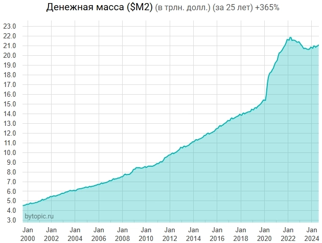 Но если сравнить средние значения ежемесячных приращений денежных масс за последние 5 лет, то выяснится, что ежемесячные приращения рублей примерно в 5 раз больше ежемесячных приращений долларов