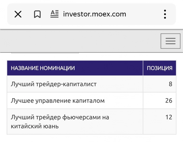 конкурсе «Лучший частный инвестор 2022 года» я занял 8 место среди трейдеров-капиталистов (у кого на брокерском счету более 3 млн. руб.) заработав почти 1,9 млн. руб. за 3 месяца (доход почти 34% за 3 месяца это около 136% годовых) investor.moex.com/trader2022?user=312595