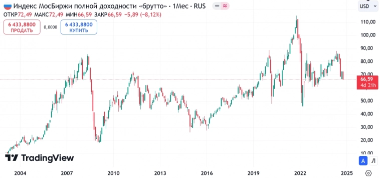 Индекс полной доходности (минус налог) мосбиржи в твердой валюте...