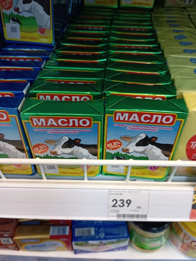 Но меня радует, что продукты еще остались в магазине. Мое любимое масло Вологодское. Стоило раньше по 229 рублей 180 грамм, сейчас 346 за ту же упаковку. Придется платить дороже, чтобы не кушать маргарин!