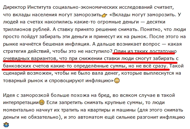 Директор Института социально-экономических исследований считает, что вклады населения могут заморозить👉 «Вклады могут заморозить. У людей на счетах накопились какие-то огромные деньги — десятки триллионов рублей. А ставку принято решение снимать. Понятно, что люди просто пойдут забирать эти деньги и принесут их на рынок. После этого на рынке начнётся бешеная инфляция. А дальше возникает вопрос — какая стратегия действий, чтобы это не наступило? Один из таких достаточно очевидных вариантов, что при снижении ставки люди смогут забирать с банковских счетов какие-то определённые суммы, но не всё сразу. Такой сценарий возможен, чтобы не было вала денег, которые выплеснутся на товарный рынок и спровоцируют инфляцию»😳