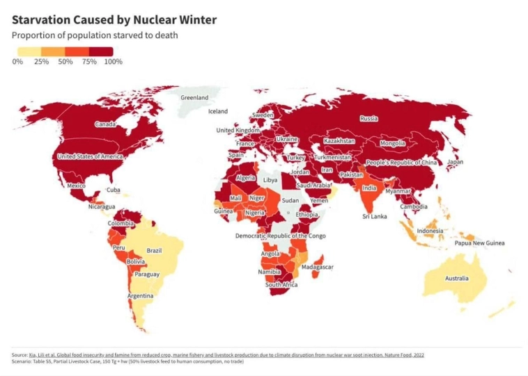 Относительно вышеприведённой карты: не могу представить, что бы в тропической стране, на берегу моря с рыбой, после ядерной войны, которая её не затронет, но уменьшит численность населения в других странах и точно уменьшит количество сейнеров и вылов рыбы, будет голод. Там не было голода даже вовремя войны с США.