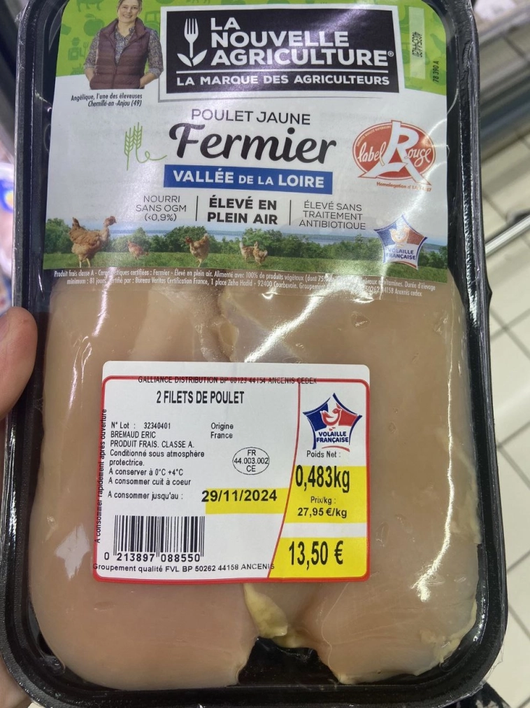 Франция. Цена за килограмм куриной грудки. 27.95 евро.