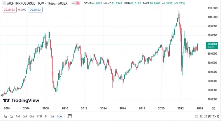 Ayrisu, вообще-то график должен быть логарифмический. Если брать по среднему, по середине интервала, то видим рост с 26 в 2004 до 91 сегодня. Это 246% в долларах. Или 4,6% годовых (на интервале 20 лет).
