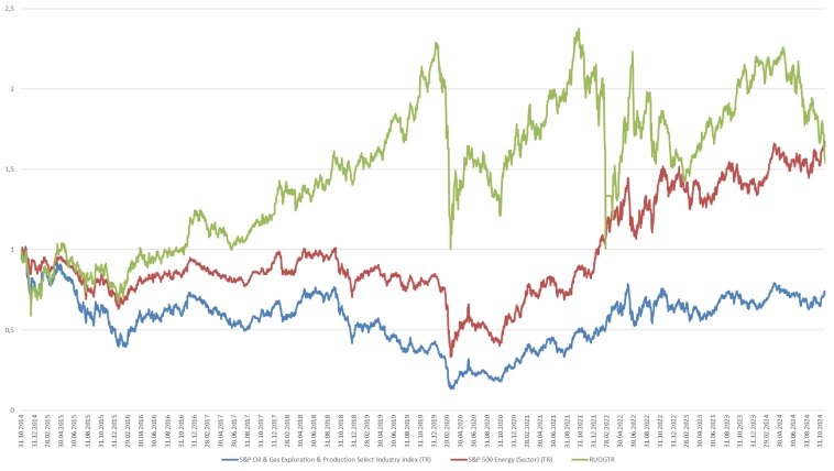 Ну и уж явно автор не видел индексы SPOil&Gas (средние и мелкие нефтяные компании, в основном сланцевики по виду) и SP500Energy (Эксоны и т.д.) по сравнению с нашим RUOGTR в долларах.