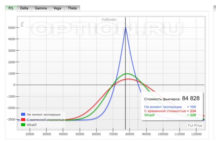 Ещё один вариант с риском от 15 до 30 тысяч рублей и доходом в 30 тысяч рублей в случае роста. При падении убыток составляет 15 тысяч рублей. Если рынок остаётся на текущем уровне, убыток составляет 30 тысяч рублей.