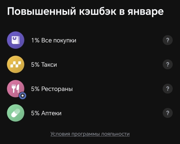 В банке появилась компенсация такси — но это не афишируется. При остатках от 5 млн — 1 поездка в месяц до 2500₽, при остатке >10 млн — 2 поездки в месяц. Только в Яндекс.Такси и только от бизнес-класса и выше: такие транзакции проходят от Яндекс ULTIMA, и это проверяется банком. Компенсируется через обращение в поддержку (платить картой Т).