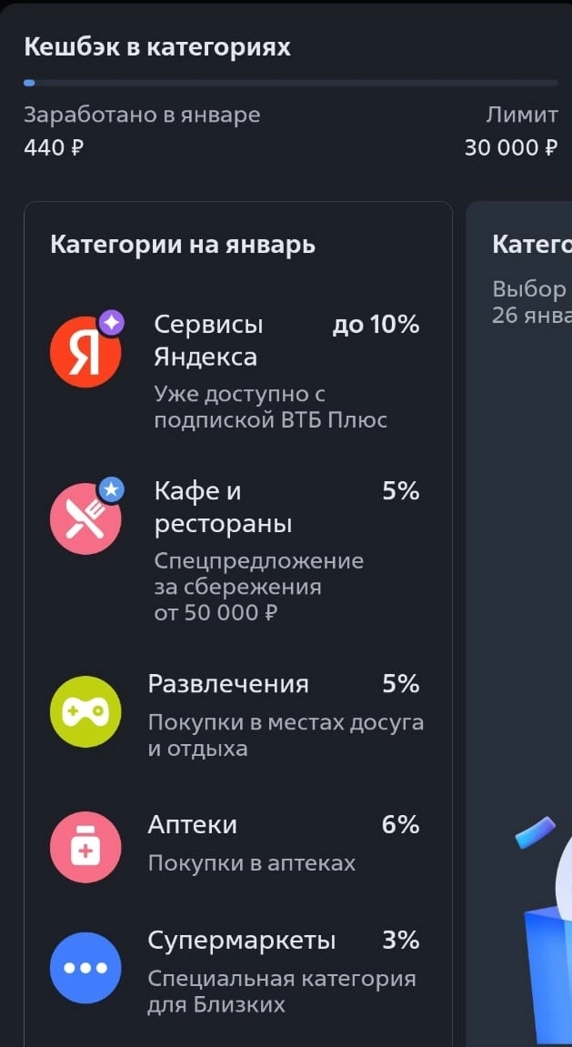 Например, согласно градации под категории у клиента должен быть кэшбек салон красоты 10%. По факту ему дают подключить в одном месяце 10%, в другом месяце 5% или 7% только. Но изначально палитру % с категориями клиент может и не знать, и просто пользоваться.