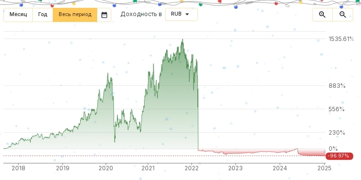 Как можно оценить результат инвестиций в российские акции по принципу “Купи и держи”, который использует Евгений и подобные инвесторы? Как фиаско.