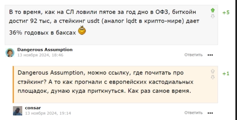 — Доход по стейкингу дает мне около 5% годовых в долларах. Обучением не занимаюсь, сорян. Тут без меня обучалкиных — пруд пруди