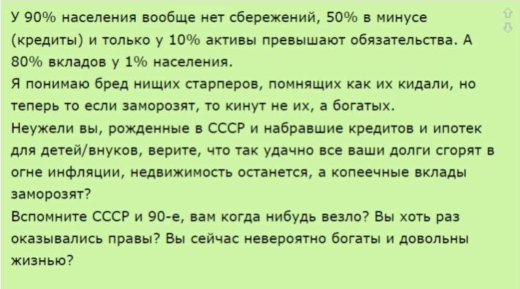 заявление у себя в телеге. Там он сообщил, что идея заморозки вкладов абсурдна, ибо попирает права граждан. Аргументировав тем, как взятыми с населения деньгами, банки спонсируют заёмщиков кредитами. А если заморозить вклады, то больше никто не понесёт деньги в банки. И это понятно, потому что денег у населения не останется. Разве только то, что было в матрасе.