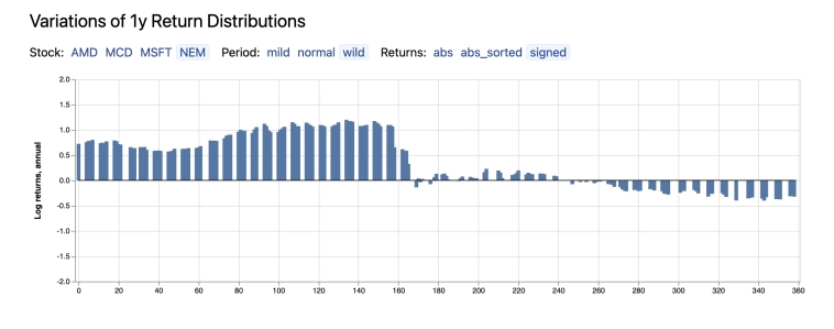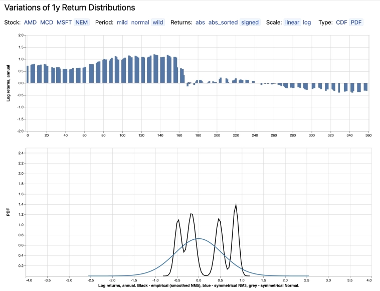Была идея — измерить текущую волатильность, для доходности акции в 1 год, как несколько (2 или 3) различных по маштабу гауссовских компонент. Используя скользящее окно также за 1 год или полгода. Т.е. вместо одной цифры волатильности, должно было получится вектор из 3х.