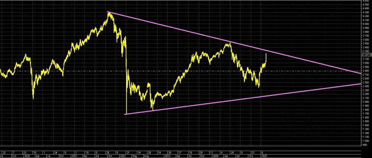 Уровни продаж (они же цели текущего роста): Почти все из вчерашнего плана выполнено в один присест, остались 3290 (мы уже тут пока пишу) и 3320. На 3290 важное сопротивление, которое может развернуть рынок в район 2200 и ниже, в случае негативного негатива, это граница нисходящего канала на дневном графике через максимумы 2021 и 2024 годов. Но пока негативом не пахнет (хотя от звонка Трампа экономика РФ не стала лучше). В случае пробоя с ретестом 3320 — открывается цель до хая 2024 года, а оттуда уже на 3800 и дальше в космос.