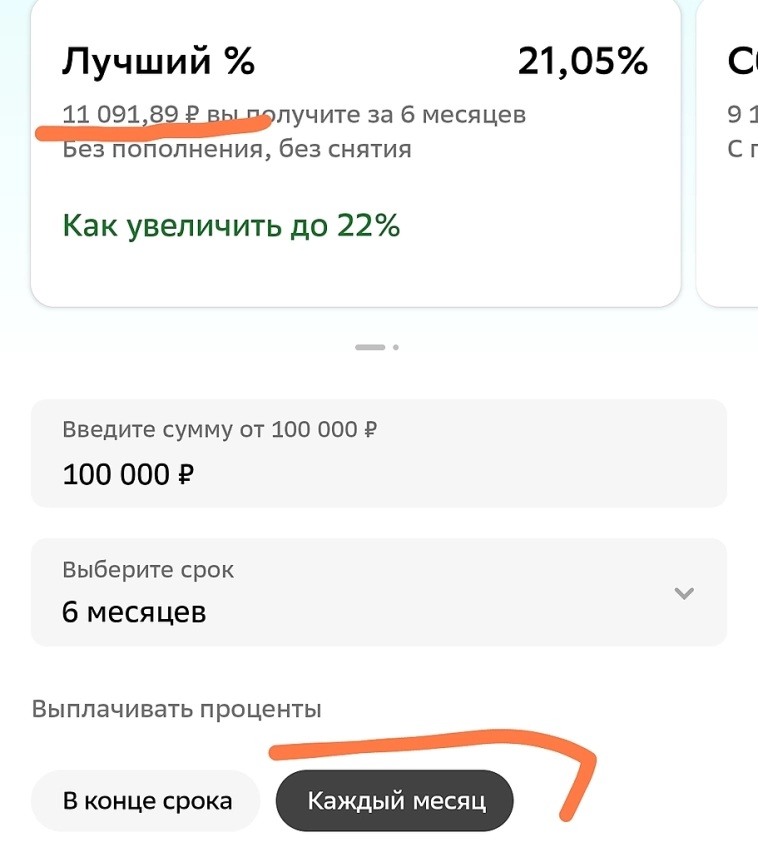 В сбере кулькулятор выдал под ежемесячный % (21.05) больше чем в конце (22) :0.