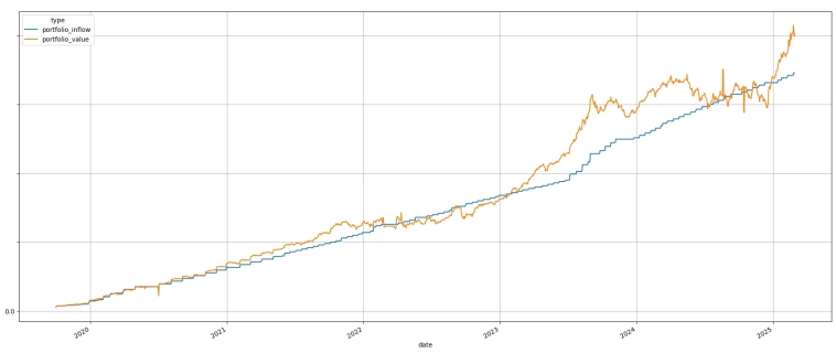 Степан на протяжении 22 лет — с 2003 по 2025 год — отправлял часть своего дохода в акции в первый рабочий день каждого месяца. Он не смотрел на текущие цены и не реагировал на новостной фон. Его ежемесячные покупки также росли из года в год вместе с инфляцией — начиная с 2000₽ в 2003 году до 12000₽ в начале 2025 года.