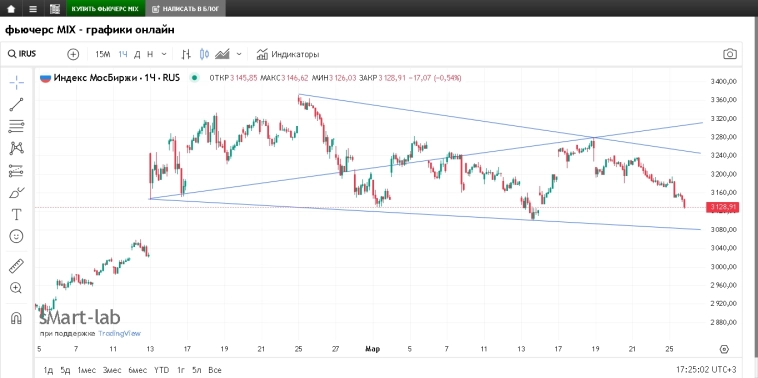 Если смотреть движение с хаёв 5 марта, то всё ещё остаётся шанс, что мы доделали или доделываем коррекцию АВС и можем возобновить рост, сигналом к продолжению которого по-прежнему является пробой с ретестом отметки 3247 и подтвердить его закреплением выше контрольного уровня 3300, что даст нам окончательный сигнал на продолжение роста в рамках 5 в 3 в 3 волны, где минимальной целью является обновление годового хая, а идеальной целью — обновление максимума 2024 года.