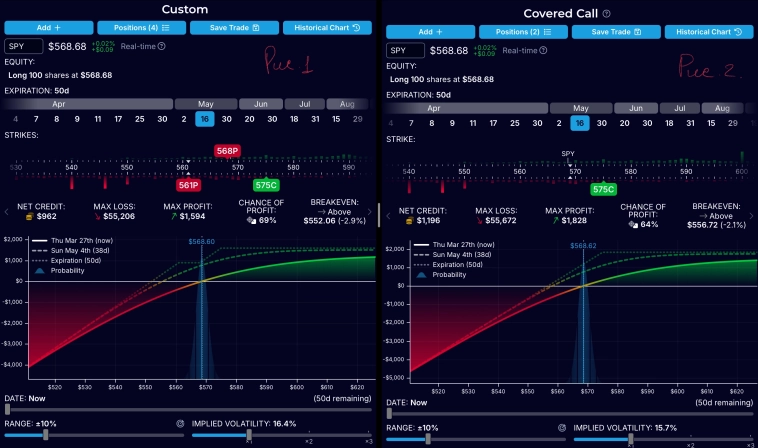 Может чего-то не понимаю, но чем предлагаемая позиция (рис1) принципиально отличается от покрытого колла (рис2), кроме того что больше ног, соответственно больше уплаченной комиссии и больше потерь на спреде ?