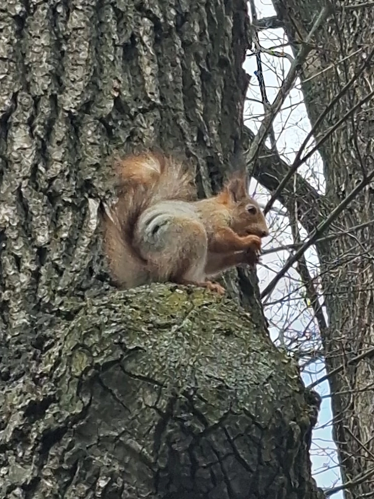 У этой белочки даже имя есть. Но орехи она берет не у всех. Приходит мужчина с тростью, трость прислоняет к дереву и она по тросточке к нему подбегает и берет орех.