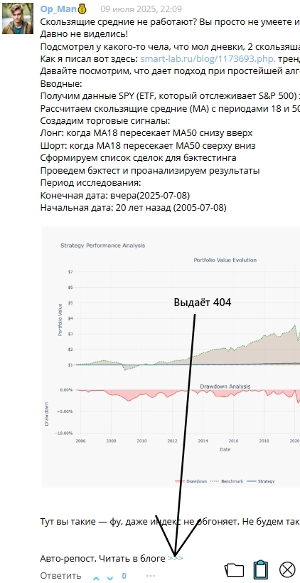 Мой бэктест показал, что эта комбинация факторов и также немного специй— а не только сам сигнал пересечения — привела к результатам, которые превзошли стратегию 'купи и держи' на исторических данных. Эмпирические данные, полученные в реалистичном бэктесте, являются для меня основным доказательством работоспособности системы, несмотря на теоретические возражения против отдельных ее компонентов.