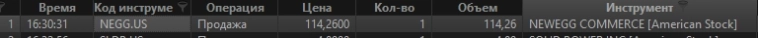 Минимальная цена была в мае 2025, а уже 31 июля 2025 была продана первая бумага с прибылью +100%: «17:36:00 NEGG.US Продажа 57,7000 1 57,70 NEWEGG COMMERCE [American Stock]». Ну продана и продана, внимания особо не обратил. В эту пятницу снова продается, посмотрел внимательнее на ситуацию, компания в моем рейтинге из-за сплита потеряла в статусе, прибыль уже неплохая, +200%, немного зафиксировал, один лот оставил.