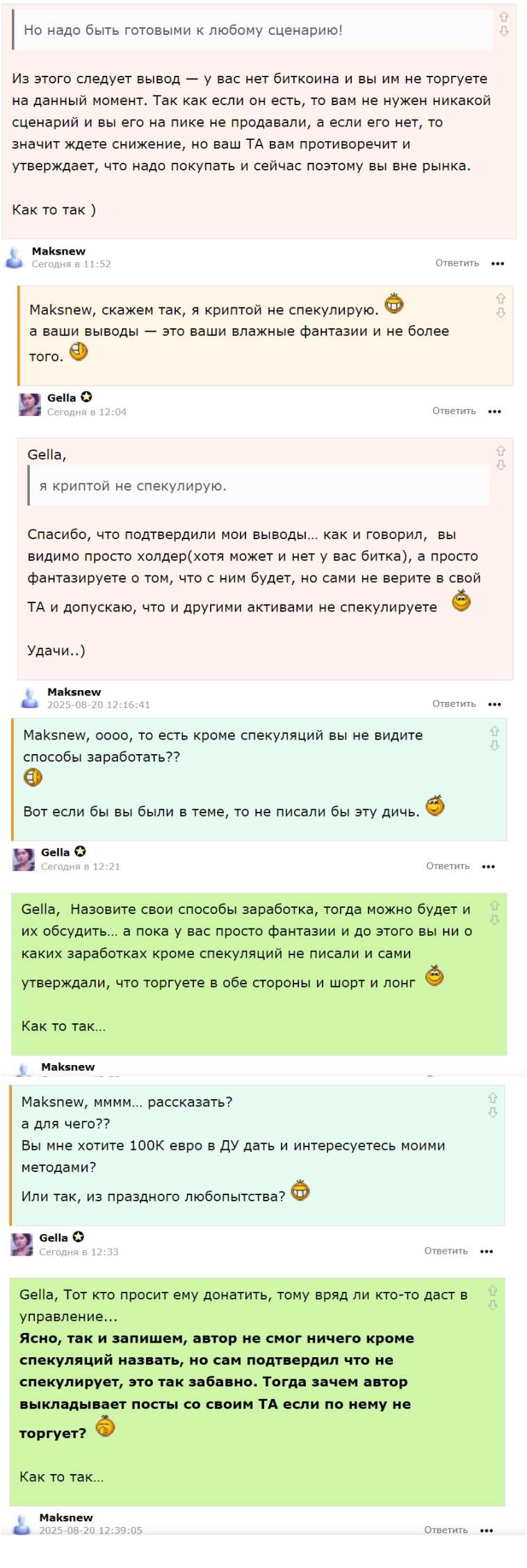 Выяснилось, что @Gella всех вводит за нос и не торгует даже по своему ТА и после переписки с ней уверен, что вообще не торгует, так как не смогла ответить на простой вопрос, чем же она зарабатывает, если не спекулирует. После такого облома, она удалила мои комментарии и занесла в ЧС, но продолжала за спиной мне хамить. Зная как она поступит, я сделал заранее скрины для истории...