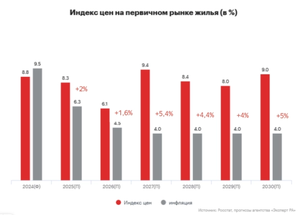 • Рост цен: Ожидается, что к 2030 году цены на новостройки вырастут примерно на 50%, опережая инфляцию в 2 раза.