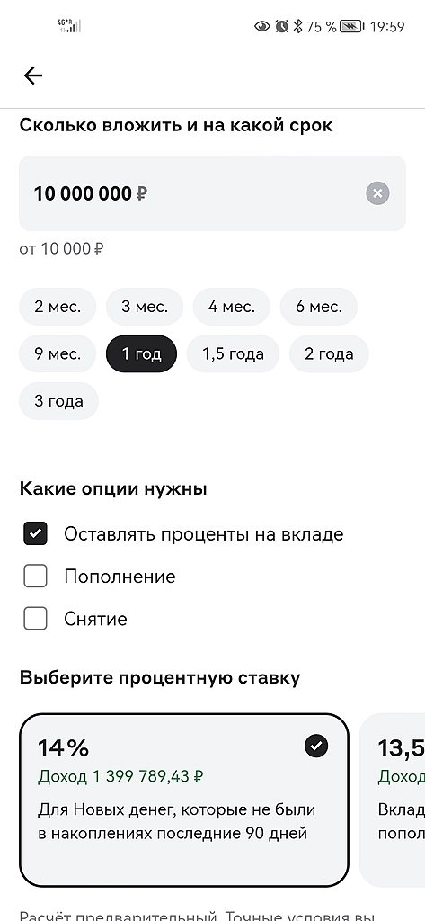 Но есть нюанс. Он не сказал, где найти вклад под 14% годовых без капитализации на 12 месяцев, эх. А где такой вклад найти? Обычно банки ведь указывают доходность именно с капитализацией, а без нее (забирая проценты ежемесячно) будет меньше.