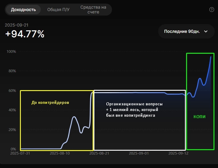 Разгон идёт тяжеловато, уже прошло 9 дней с начала торговли, а я до сих пор не иксанулся. Да, долго запрягал, первая сделка копиистов была 14 сентября. До этого оформлял народ в пул, занимался организационными вопросами и прочей рутиной.