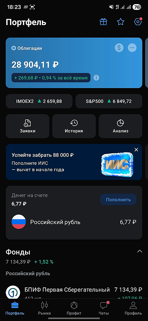 · ОФЗ 26241 (погашение 15.03.2033) — купон 7.6%, цена ~80.2%. Покупка по ~804.3 ₽.