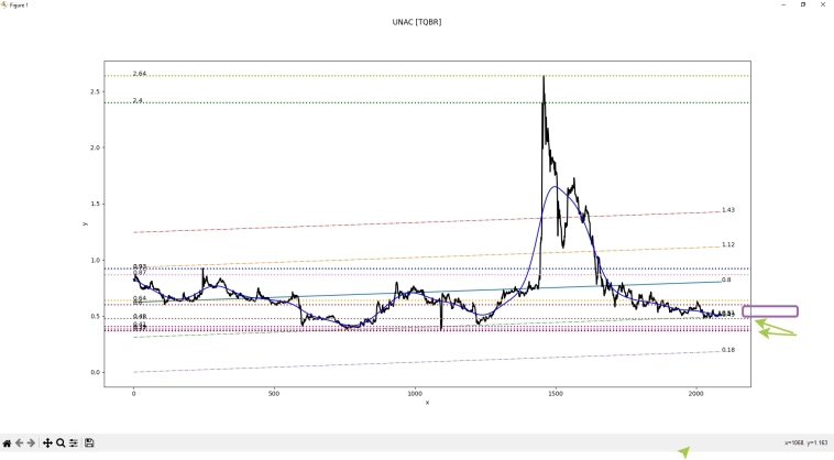 Странно таким торговать. Возможно, соплежевание в районе 0,4-0,5 может длиться вечно. Спекулировать — стремно, инвестировать, дело вкуса. Есть бумаги интересней. Дневной график, со всякой ТАшной мишурой скрипт нарисовал.