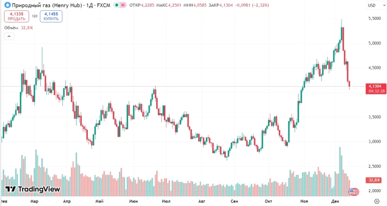 Напомним, что стартовую неделю декабря в США уже назвали самой холодной с 2010 года. Естественно, потребность в отоплении растет, домохозяйства и предприятия наращивают потребление голубого топлива, что удерживает цены на трехлетнем максимуме.