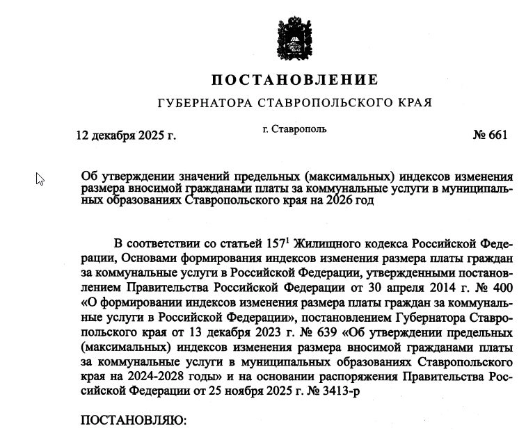 Власти Ставрополья утвердили новые индексы роста платы за коммуналку на 2026 год